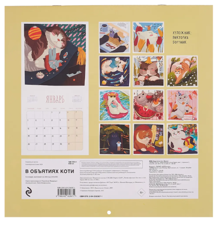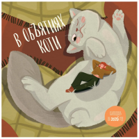 Внутри календаря комичные огромные коты и их маленькие люди.