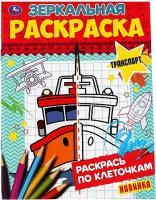 Зеркальная раскраска «Транспорт» ТМ «УМка» приглашает порисовать: - раскрашиваем по клеточкам - знакомимся с понятием «симметрия» - запоминаем названия разных видов транспорта - удобный формат В данной раскраске маленькому художнику предлагается дорисовать правую часть картинки в зеркальном отображении, а затем раскрасить её согласно цветовой гамме левой стороны рисунка. Благодаря компактному размеру раскраску удобно брать с собой в дорогу. Игровые занятия с зеркальной раскраской ТМ «УМка» способствуют тренировке внимания и памяти, а также развивают: - образное мышление - логику - мелкую моторику - усидчивость