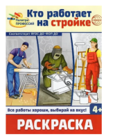 В раскраске «Кто работает на стройке» представлены следующие профессии: каменщик, кровельщик, маляр, монтажник, столяр, сварщик, слесарь-сантехник, электрик.