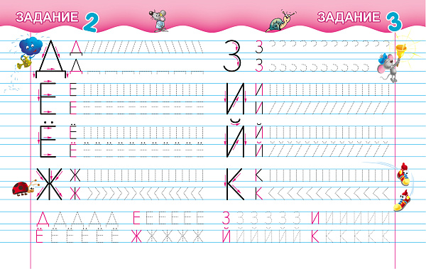 Эти прописи помогут ребёнку в игровой форме развить зрительное восприятие, внимание, мелкую моторику и координацию движения руки. Чтобы малыш не уставал, прописи разделены на отдельные задания, не перегружены упражнениями, графические элементы даны в увеличенном виде. Каждой букве соответствуют рисунки, способствующие закреплению знаний. Стрелки на буквах указывают начало действия при их написании. Сначала пишем буквы по элементам, а затем закрепляем навыки их написания по линейкам внизу страницы.